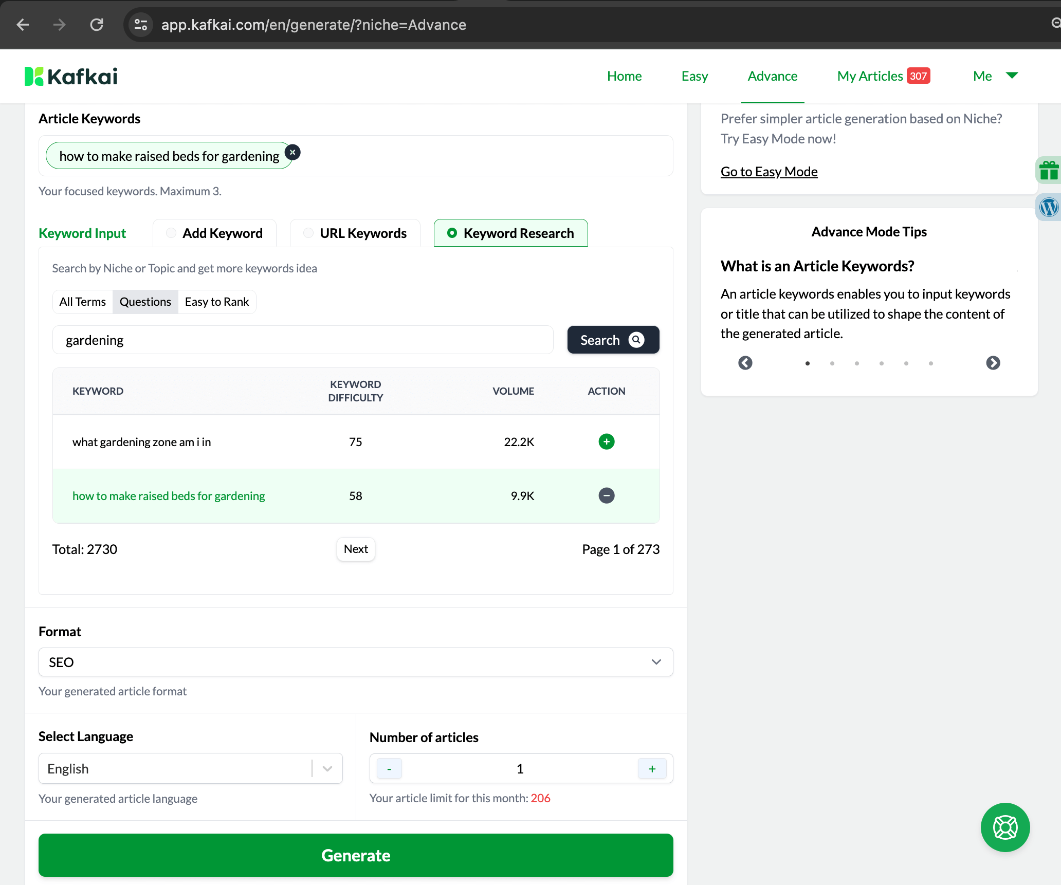 Kafkai users now can easily find long tail keywords that are good for SEO, and instantly generate SEO Optimized articles based on the selected keywords.